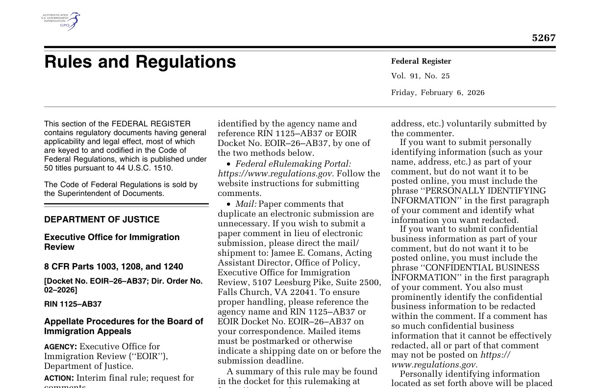 On February 6, 2026, the DOJ published an interim final rule in the Federal Register restructuring how the BIA handles appeals.