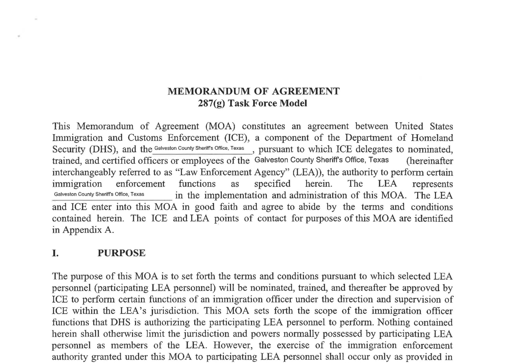 Galveston County has signed more 287(g) agreements than any other county in the Houston area, covering both jail-based and community-based enforcement: